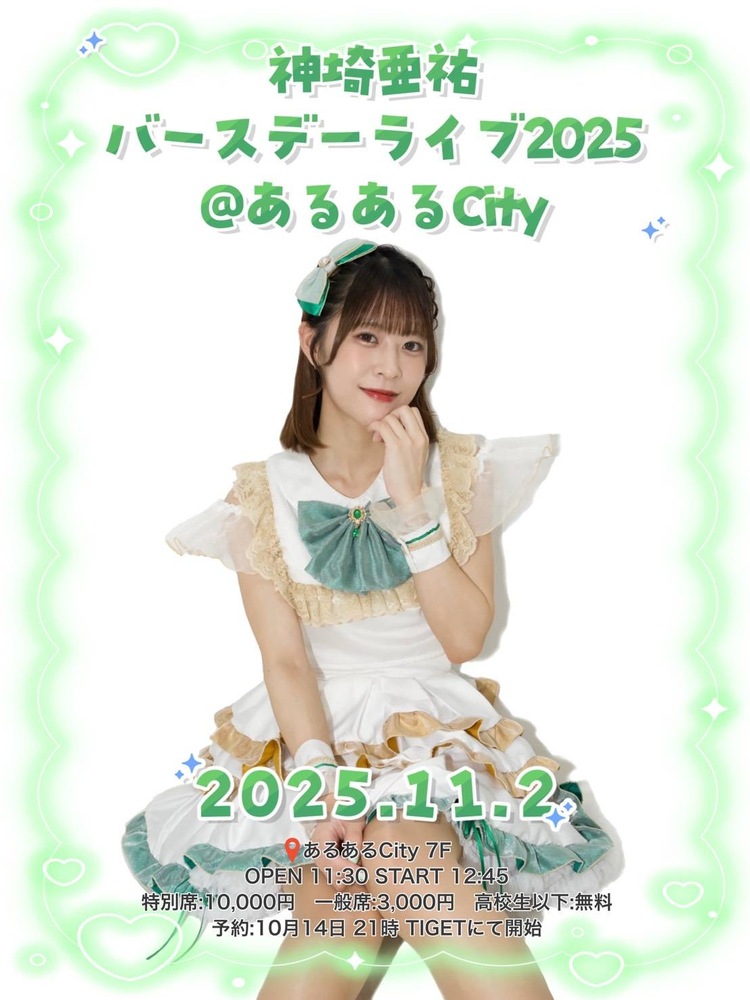 神埼亜祐バースデーライブ2025 SCHEDULE 2025/11/02(日) あるあるシティ7Fホール 地図を表示 【日程】2025年11月2日 ㈰ 【開場】11:30【開演】12:45 【会場】あるあるCity 7F 【料金】 特別席 10,000円 一般席 3,000円 高校生以下 入場無料 【出演】 えくれあエクレット DEPARTURES moz 愛◆Dream QunQun☆RinU 小鳥遊朱寿 CandyCross 青春女子学園 Dear Princess #SSSG パピマシェ 【予約開始】 2025年10月14日 21:00より URLをコピーする 報告する